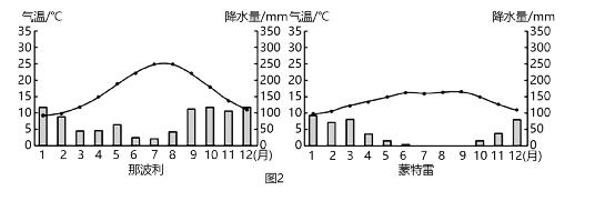 【详解】(1)特点:比较两幅气候资料图中的气温曲线可以看出,那波利比蒙特雷夏季气温更高,气温年较差更大;比较降水柱状图可以看出,那波利比蒙特雷年降水总量大,且降水时间较长。原因:结合所学知识,蒙特雷受加利福尼亚寒流影响,降温减湿明显,气温低,降水少;两地都地处中纬度大陆西岸,降水都主要受西风带的影响,从图可以看出那波利纬度高于蒙特雷,因此受中纬西风控制的时间更长,因而降水时间更长,导致年降水量更多。