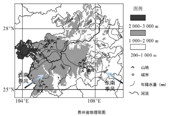 【详解】(1)由图结合区域地理知识可知,贵州位于25°N~35°N的亚欧大陆东岸,夏季受西南季风和东南季风共同影响,冬季受西北季风影响,形成亚热带季风气候;亚热带季风气候下,发育的典型自然植被是四季常绿的亚热带常绿阔叶林。