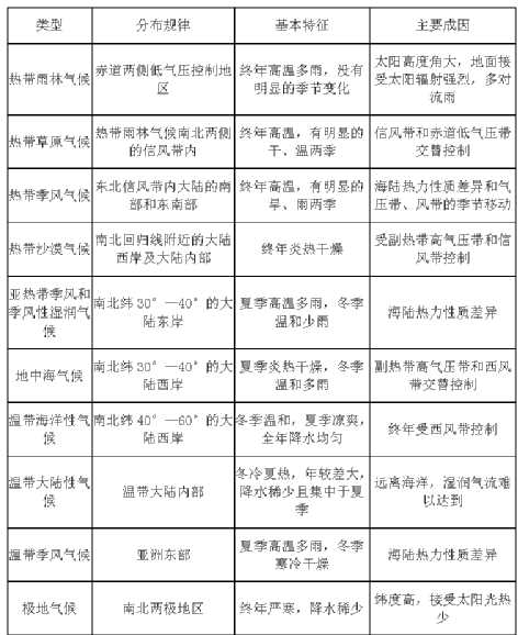 气候要素包括气温和降水。影响气候的因素归根结底是影响气温和降水的因素。不同的气温和降水组合就形成了不同的气候类型和特点。