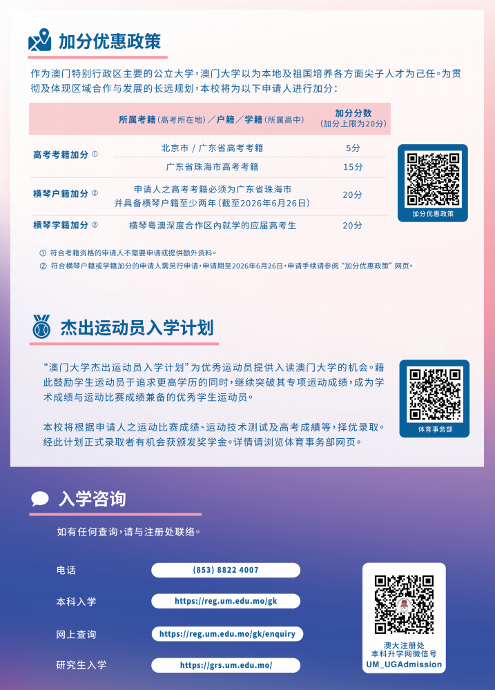 澳门大学2026内地本科生招生日程发布,报名日期为2026年5月4日至6月26日,本文整理了澳门大学2026内地本科生加分及优惠政策,供考生参考。