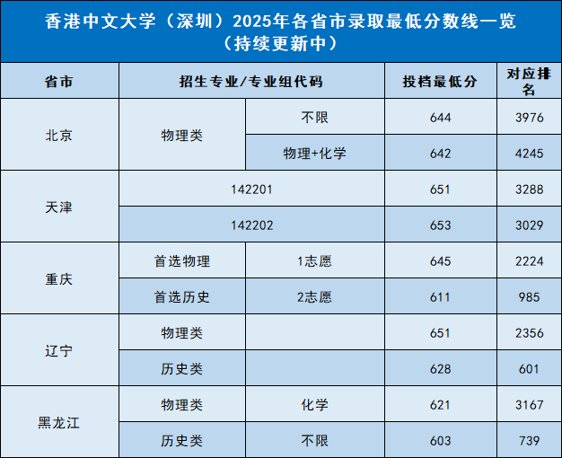 香港中文大学(深圳)2025年面向以下省市进行招生: