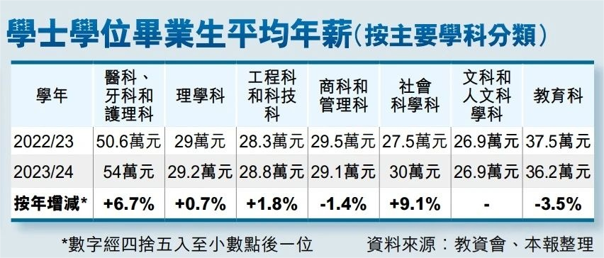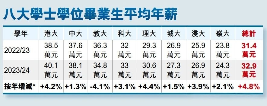 整体来看,毕业生平均年薪32.9万元,月薪约2.75万港元,同比上涨4.8%,延续近年上升趋势,但不同院校、不同专业的差距依旧明显。