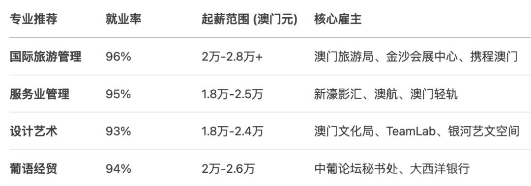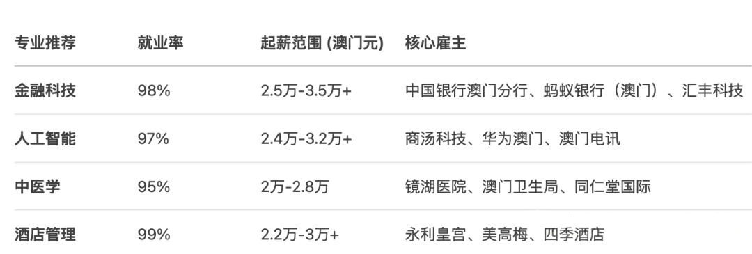 平均月薪约1.3万人民币,八成毕业生从事与专业相关工作,热门专业如资讯科技、中葡翻译等薪资更具竞争力。