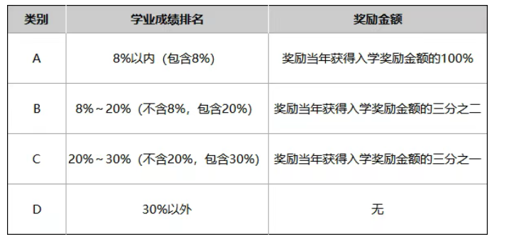 9、全额及半额奖学金续得成绩要求:全额及半额奖学金的发放原则上为期四年,每学年结束后须进行续得审核。为鼓励更多成绩优秀的学生在学业上继续努力,根据学生上一个学年度的平均成绩(YGPA)排名(本年级或本年级本专业或本年级本大类,以排名最前的数据为准)进行审核,排名及相应的续得奖学金金额如下:
