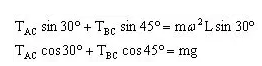 例2. 如下图所示,两绳系一质量为m=0.1kg的小球,上面绳长L=2m,两端都拉直时与轴的夹角分别为30°与45°,问球的角速度在什么范围内,两绳始终张紧;当角速度为3rad/s时,上、下两绳拉力分别为多大?