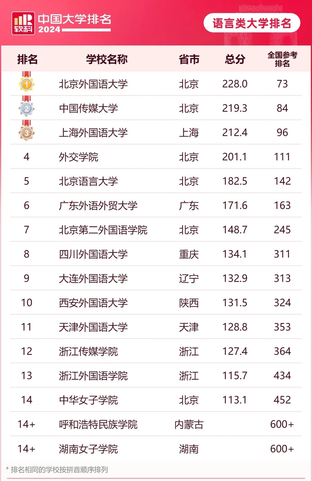 2024软科中国语言类大学排名共有16所高校上榜。其中,北京有5所院校位列前十,分别为:北京外国语大学(第一)、中国传媒大学(第二)、外交学院(第四)、北京语言大学(第五)、北京第二外国语学院(第七),可见院校实力不容小觑!