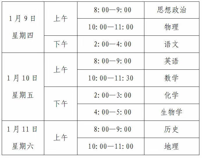 注:报考英语科目的:笔试,按准考证上的时间、地点参加考试;听力考试,高中学生(离校往届生)随学校参加期末听力考试,职技类和社会考生由考试中心统一安排参加听力考试,考试时间2025年1月3日。4.2025年1月23日:发布成绩。