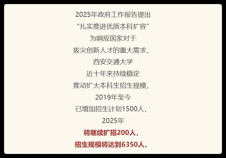 在去年扩招基础上,2025年继续稳步增加本科生招生名额超100人。扩招重点锚定国家战略需求,精准对接基础学科支撑、前沿交叉学科建设、战略急需领域突破三大方向,打造人才培养高地。