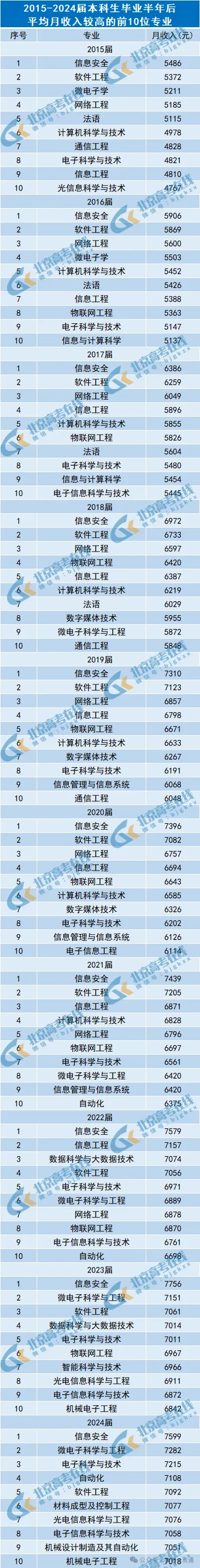 可以看到,计算机科学与技术、法语、数字媒体技术、通信工程、信息管理与信息系统、微电子学、信息与计算科学、电子信息工程、光信息科学与技术,这9个专业连续三年无缘本科高薪榜单。