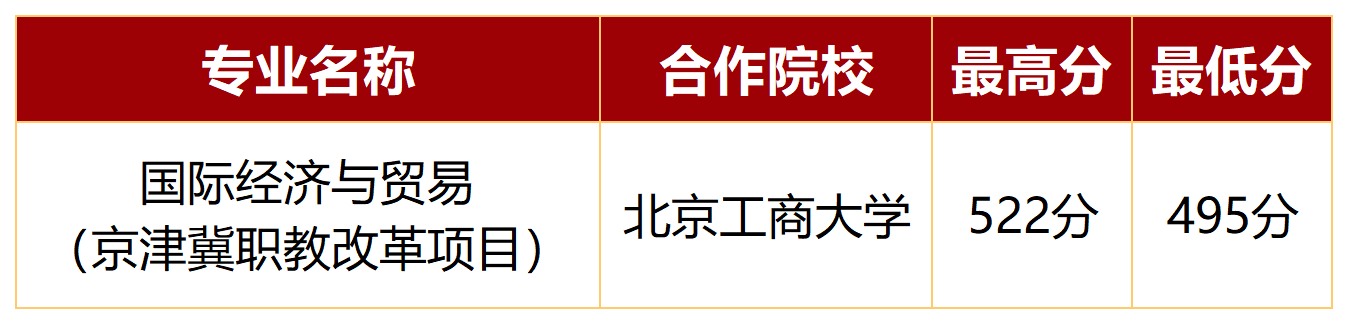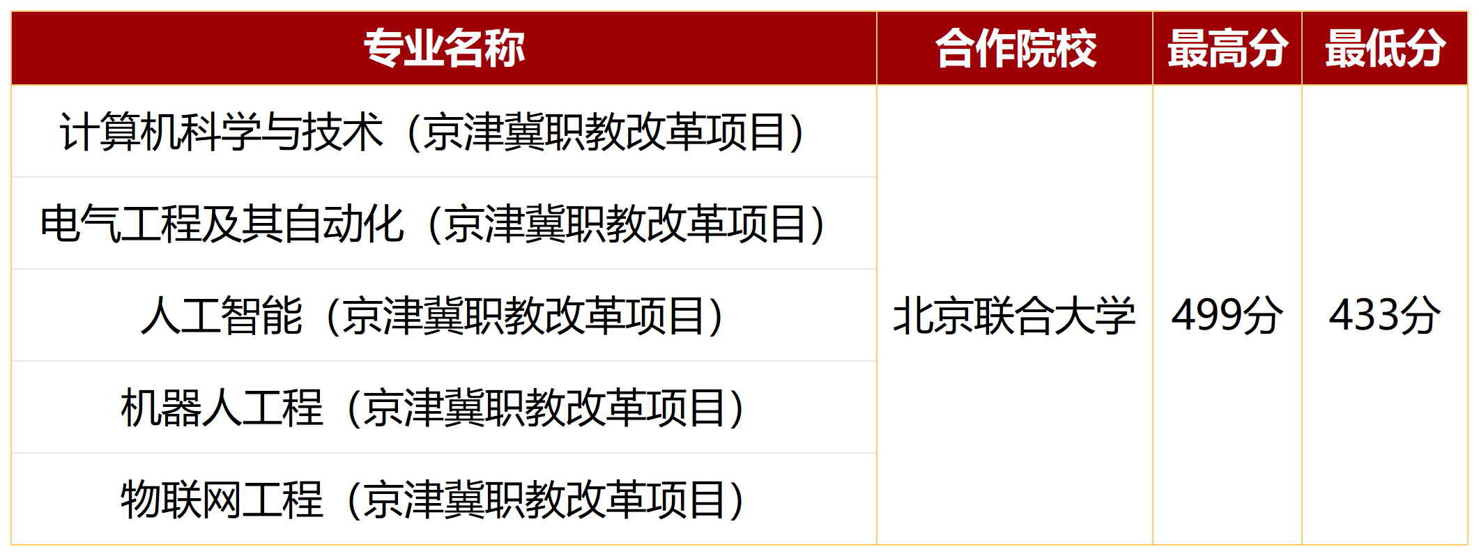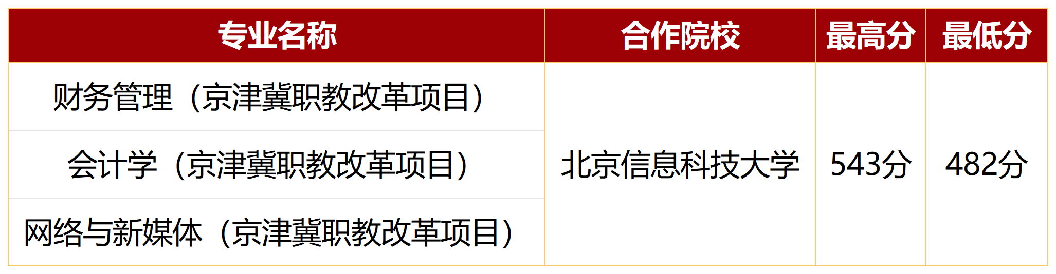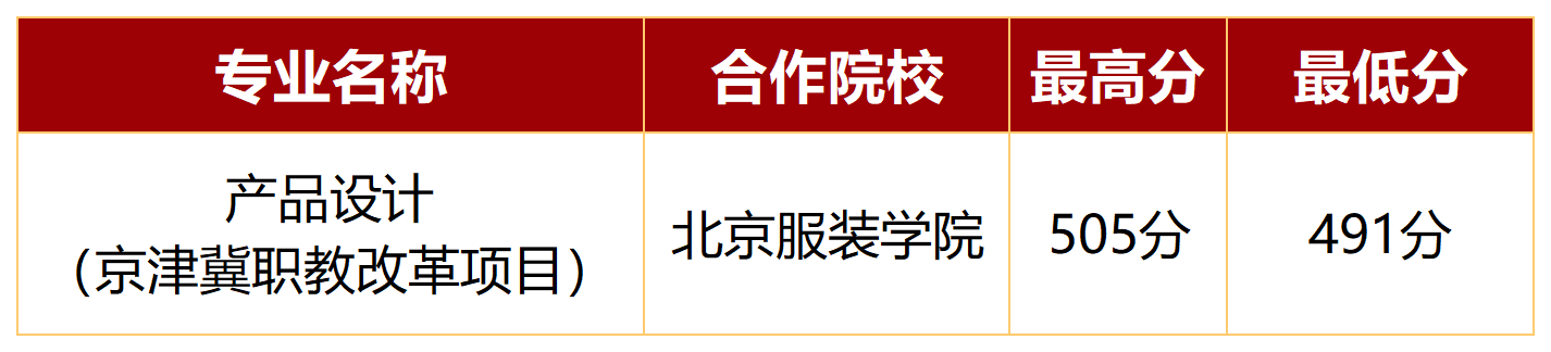今年京津冀职教改革项目各招生专业取得了诸多亮眼成绩:产品设计(京津冀职教改革项目)最低录取分数491分,超过本科提档线168分,再创新高;会计学(京津冀职教改革项目)最低录取分数488分,逆势上涨,超过本科提档线58分。