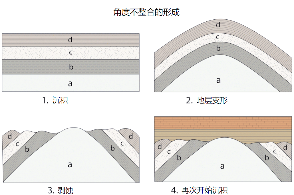 ②角度不整合:上下地层不平行,呈一定角度相交,中间缺失部分时代地层,有沉积间断和构造变动(如褶皱)。反映先沉积、后褶皱抬升剥蚀、再下降沉积。