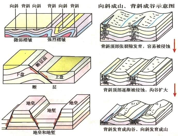 注意: 背斜顶部常被侵蚀形成谷地(背斜谷)。