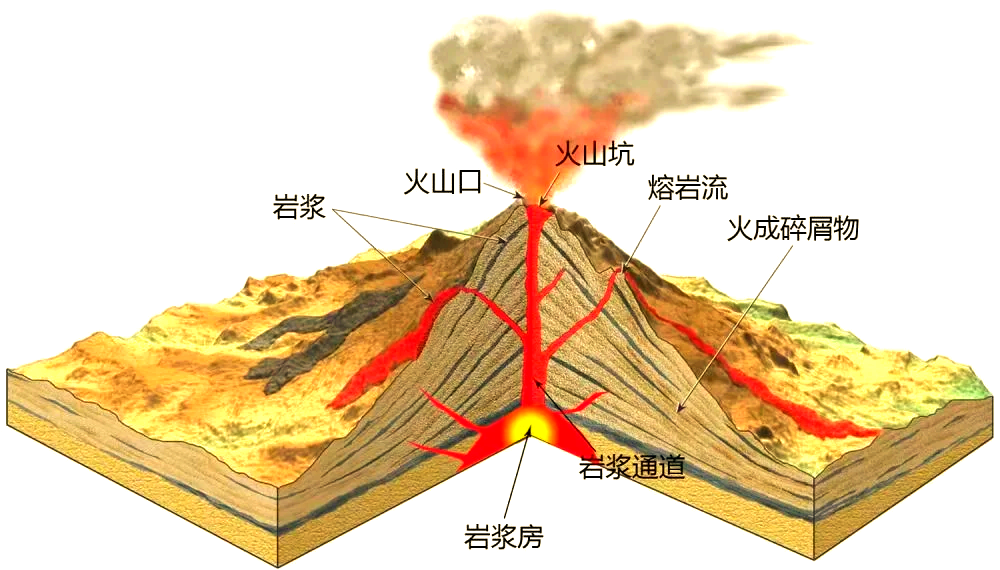 (2)喷出岩体:如玄武岩流,覆盖在原有地层之上,与下伏地层为沉积接触(喷出岩作为基底)或喷发不整合。可能有气孔、流纹构造。