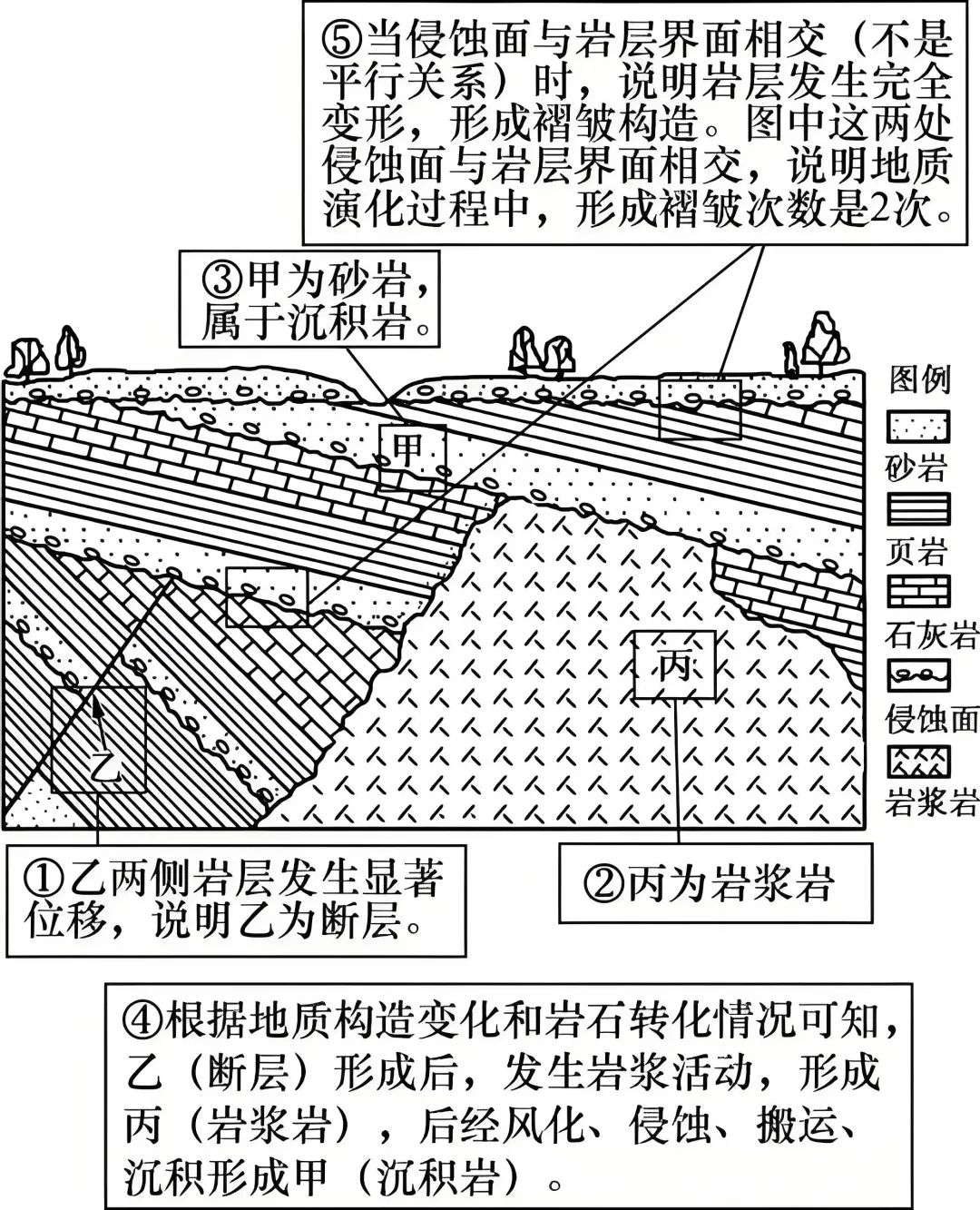 ③分析褶皱、断层的形成顺序(通常被切断的构造形成较早)。
