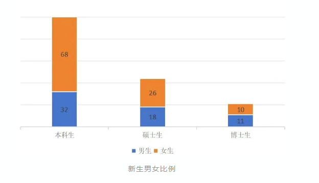 100位本科新生中,男生有32人,女生有68人;44位硕士新生中,男生有18人,女生26人;21位博士新生中,男生有11人,女生有10人,男女比例相对接近。