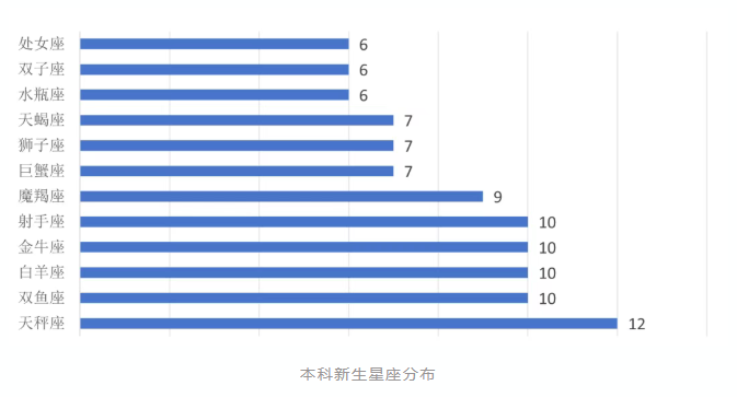 100位本科新生的星座分布中,天秤座以12人拿下魁首,相比之下,水瓶座、双子座与处女座分别只有6人,显得更加珍稀。