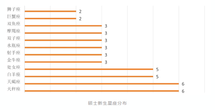 44位硕士新生星座分布更加均匀。天秤座与天蝎座人数最多,分别有6人;巨蟹座与狮子座人数最少,分别只有两人。