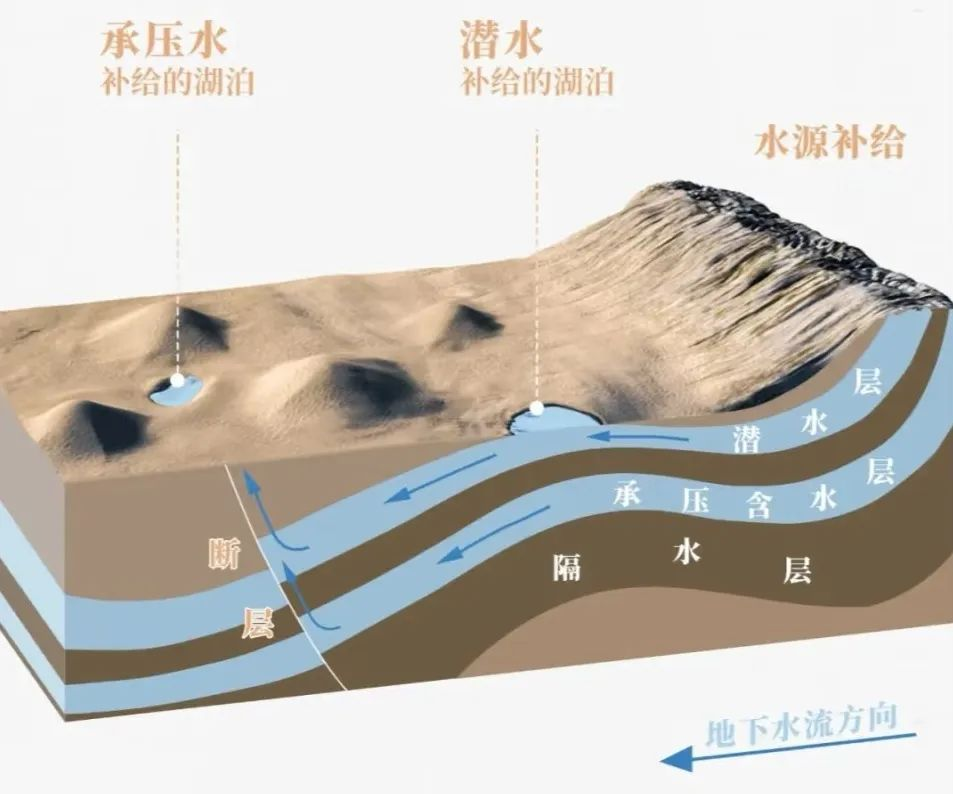 ③透水层与隔水层组合:透水层(如砂岩、裂隙发育的灰岩)输送含盐地下水,隔水层(如页岩、粘土)阻挡其向四周扩散,迫使其在特定地点(如隔水层被切穿处)上升涌出。