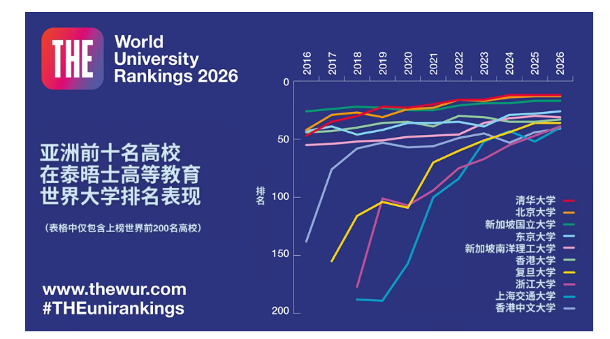 2026年泰晤士高等教育世界大学排名中亚洲高校持续提升排名,今年更取得若干显著突破,而美国高校则延续下滑趋势。
