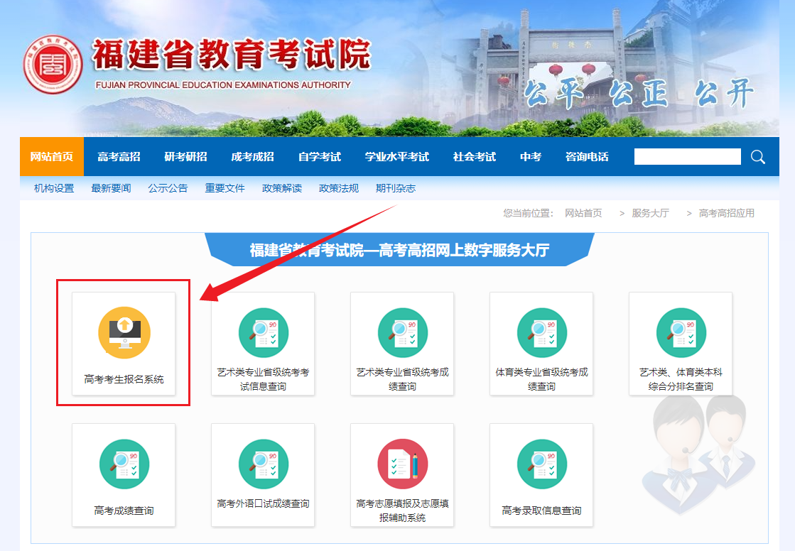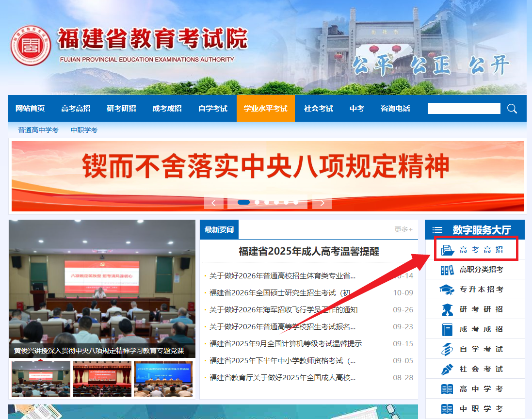 1.申请报名参加2026年我省普通高考的所有人员(包括保送生,“强基计划”,高水平运动队招生,运动训练、武术与民族传统体育专业招生,残疾考生单独招生,职教师资班,少年班等,下同)须于2025年10月23日至28日登录福建省教育考试院网站(www.eeafj.cn)“数字服务大厅—高考高招—高考考生报名系统”,进行网上账号注册、报名和缴费,逾期不予网上报名。