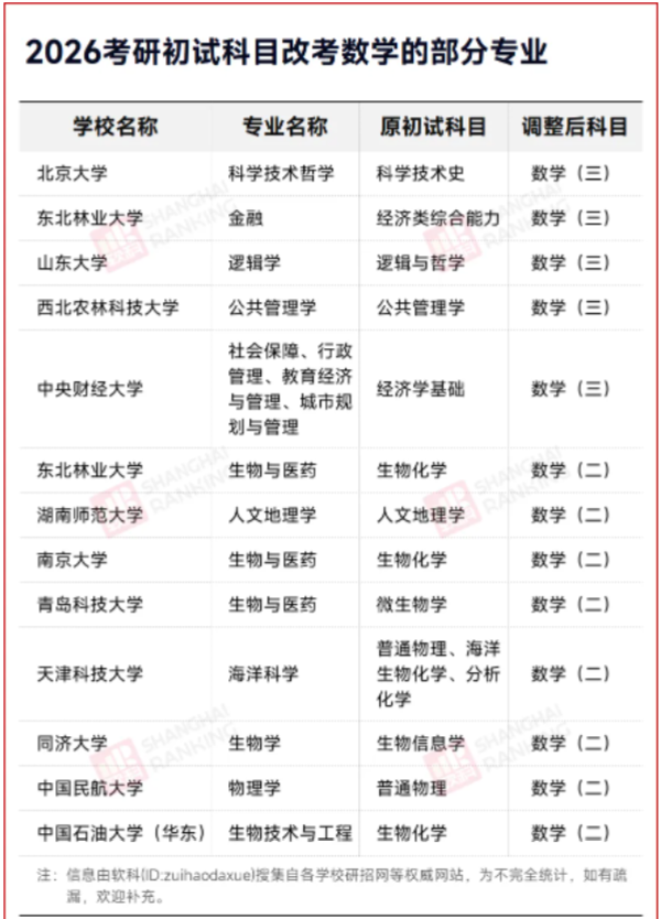 最突出的变化是——北京大学、山东大学等高校的哲学、经管类部分专业改考数学(三)。南京大学、同济大学等高校的生物相关专业初试科目调整为数学(二)。