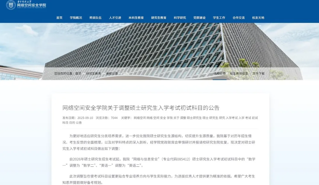 华中科技大学网络空间安全学院宣布,为更好地适应研究生分类培养需求,进一步优化硕士研究生生源结构,切实提升生源质量,自2026年硕士研究生招生考试起,网络与信息安全的初试科目数学(一)调整为数学(二)、英语(一)调整为英语(二)。