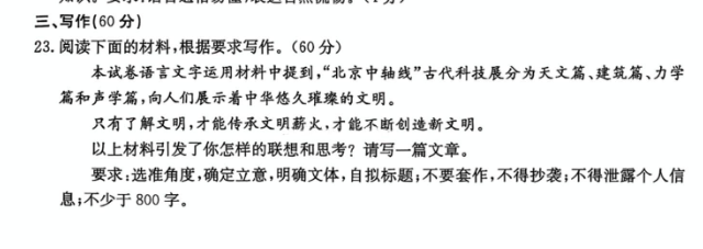 本试卷语言文字运用材料中提到,“北京中轴线”古代科技展分为天文篇、建筑篇、力学篇和声学篇,向人们展示着中华悠久璀璨的文明。只有了解文明,才能传承文明薪火,才能不断创造新文明。以上材料引发了你怎样的联想和思考?请写一篇文章。