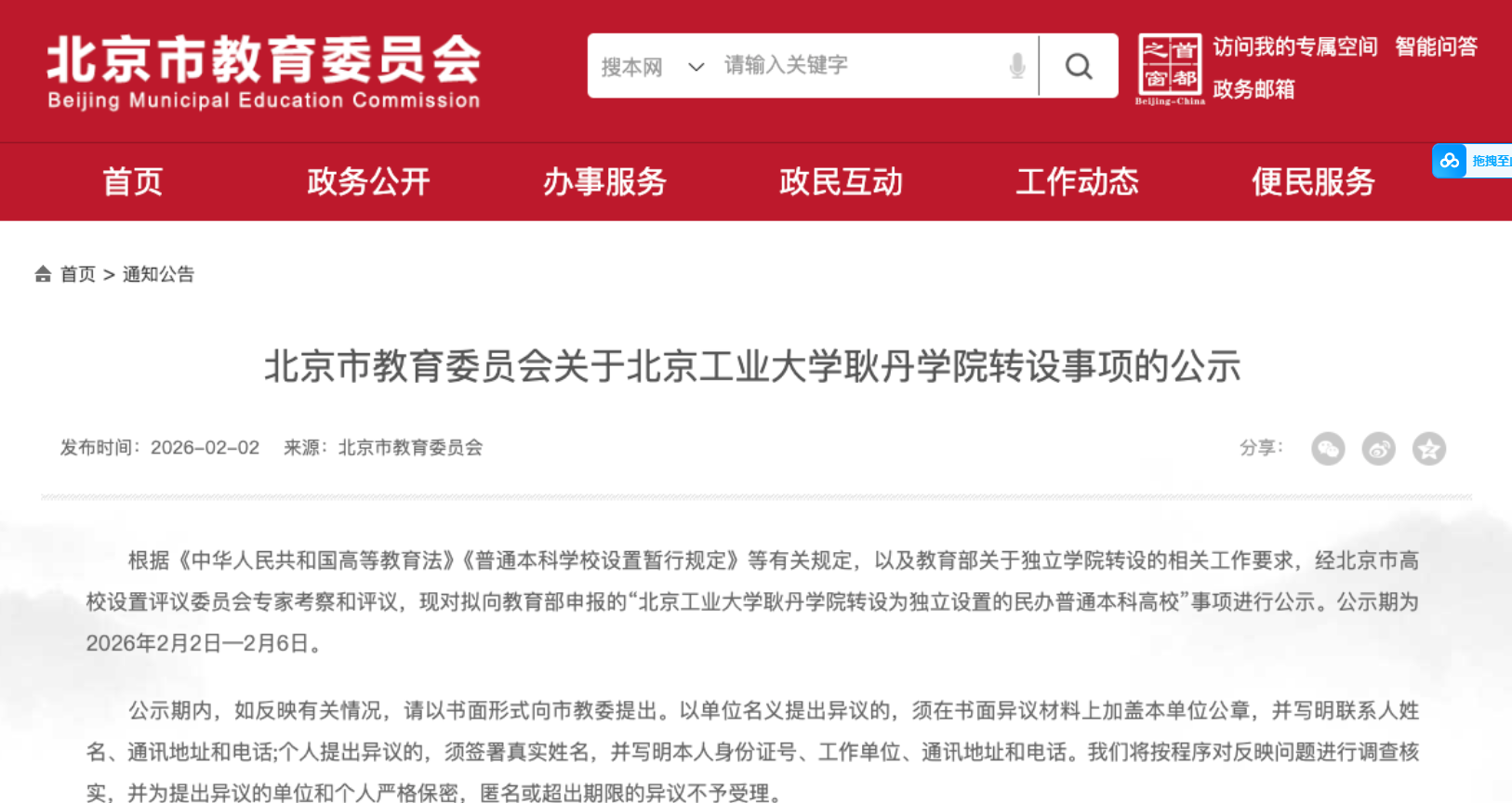 2月2日,北京市教委网站发布《北京市教育委员会关于北京工业大学耿丹学院转设事项的公示》。