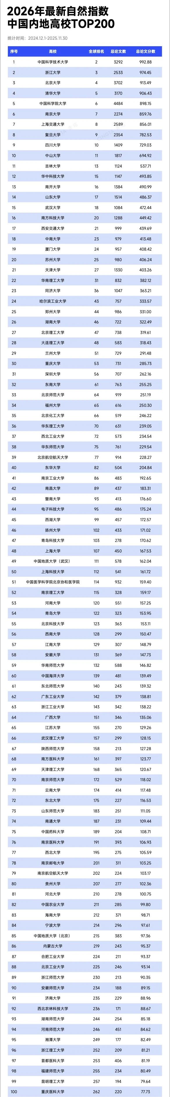 近日,自然指数官网更新了最新的自然指数排名(统计时间节点为2024.12.1-2025.11.30)。中国科学技术大学以992.88的总论文分数,居全球第二、中国内地高校第一;其次是浙江大学,居全球第三位、国内第二;北京大学居于全球第四位、国内第三。