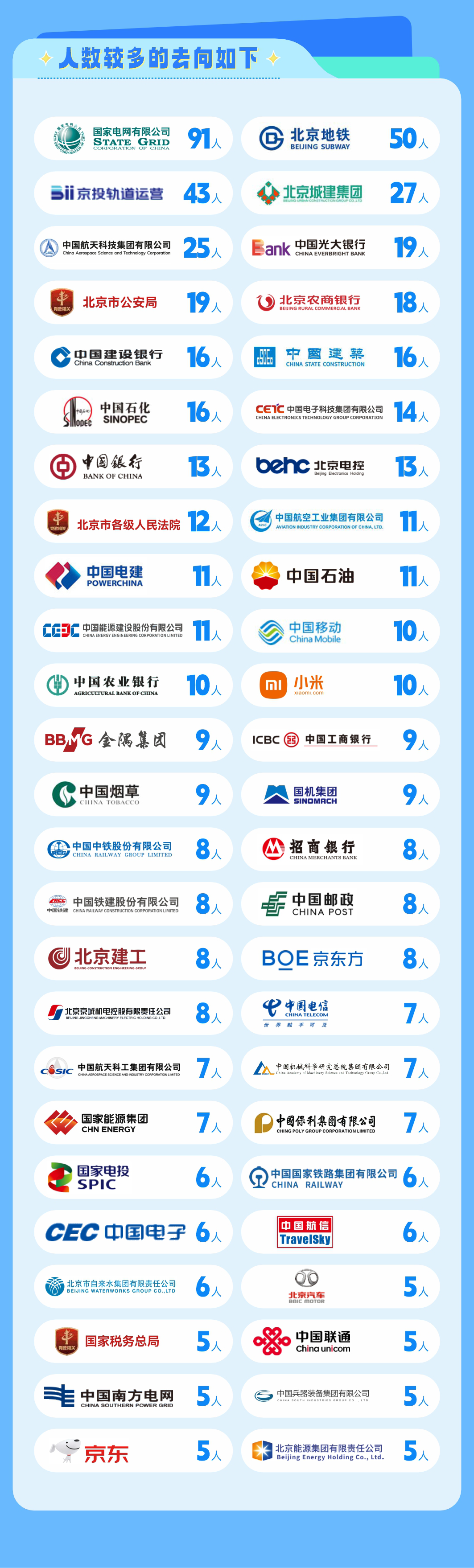 境内升学:境内升学的毕业生中,43% 选择留在本校继续深造,其余毕业生赴国内多所顶尖高校及科研院所就读,包括北京大学、中国人民大学、上海交通大学、浙江大学、哈尔滨工业大学、西安交通大学等 985 高校,以及中国科学院大学、中国政法大学、中央财经大学等特色专业院校。其中升学人数较多的院校有北京交通大学(37 人)、北京邮电大学(34 人)、北京工业大学(33 人)、北京科技大学(27 人)等。