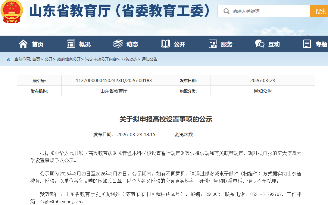 山东省教育厅发布《关于拟申报高校设置事项的公示》。根据《中华人民共和国高等教育法》《普通本科学校设置暂行规定》等法律法规和有关政策规定,现对拟申报的空天信息大学设置事项予以公示。学校官网显示,这是我国第一所以“空天信息”命名的高等院校。
