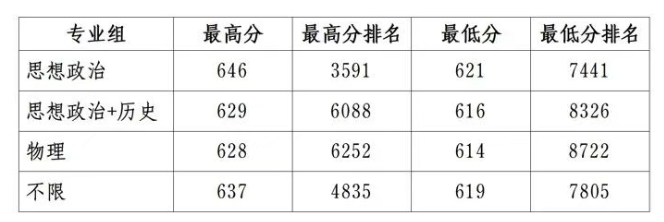 3.专业录取规则:提档比例一般不超过120%。确定专业时,按考生的实际高考总分(不含政策加分) 排队,由高到低依次录取。同分且均无政策加分的考生将依次比较外语、语文、数学单科成绩。各专业志愿间不设级差,实行“分数优先”原则。