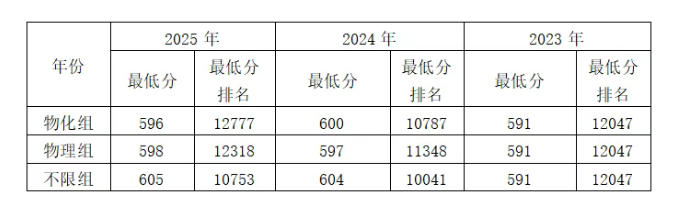 2023年录取最高分为623分,排名为6375名,录取最低分为591分,排名为12047名。2024年录取最高分为631分,排名为5623名,录取最低分为597分,排名为11348名。2025年录取最高分为627分,排名为6561名,录取最低分为596分,排名为12777名。