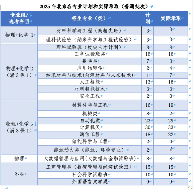 2025年普通类共录取212人,2026年在京招生计划稳中有增。2026年将继续实行“满三保一”政策——考生填满我校专业组内前3个不同专业,体检符合要求,确保进档后至少录取前3专业中的一个。北科大在京招生专业组设置一向很干净,投放的专业均为优势热门专业,2026年还会继续优化,敬请关注!