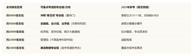 报考策略:对于不限选考科目的考生,可按“琢玉班→会计/金融/法学组→经济组→管理组”的顺序拉开梯度填报。对于选考“物理”或“物理+化学”的考生,可优先填报对应专业组,并将单选物理组作为保底选择。充分利用首经贸招生计划多、分数稳定、转专业政策宽松的特点,实现“保录取、冲好专业”的目标。
