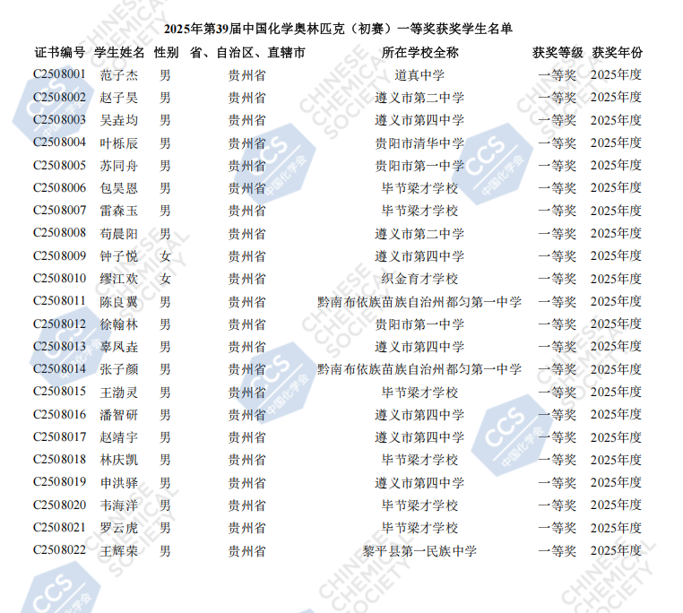 2025贵州省第39届化学竞赛初赛省一获奖名单