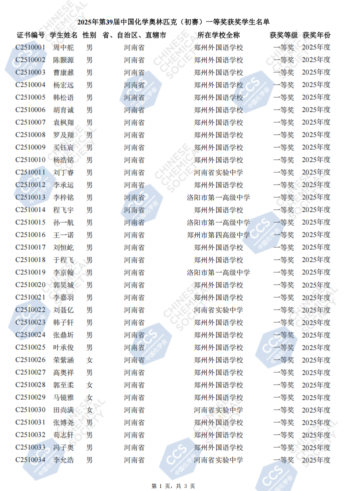 2025年9月7日举行的第39届中国化学奥林匹克(初赛)省份的一等奖学生名单已经公示,公示期为2025年9月21日至27日,北京高考在线整理了2025河南省第39届化学竞赛初赛省一获奖名单,希望对考生有所帮助。
