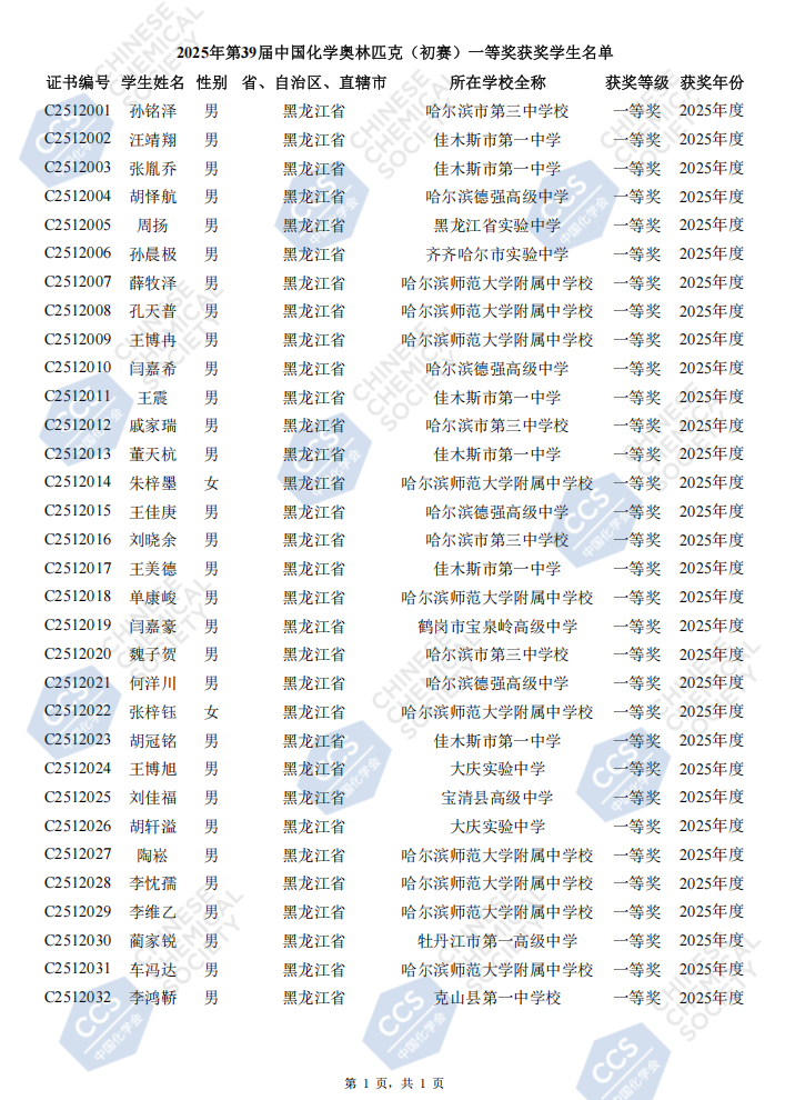 2025年9月7日举行的第39届中国化学奥林匹克(初赛)省份的一等奖学生名单已经正式公布,北京高考在线整理了2025黑龙江省第39届化学竞赛初赛省一获奖名单,希望对考生有所帮助。