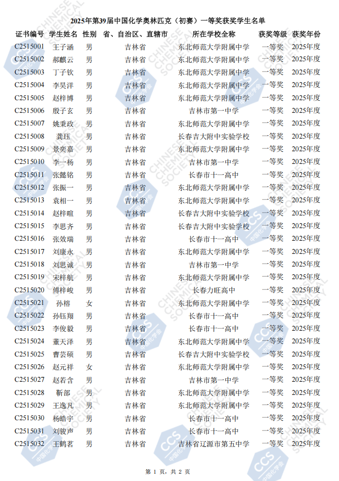 2025吉林省第39届化学竞赛初赛省一获奖名单