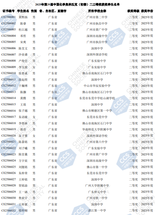 2025广东赛区第39届化学竞赛初赛省二获奖名单