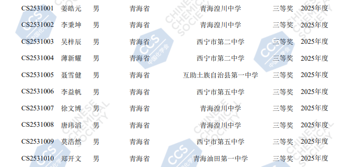 2025青海赛区第39届化学竞赛初赛省三获奖名单