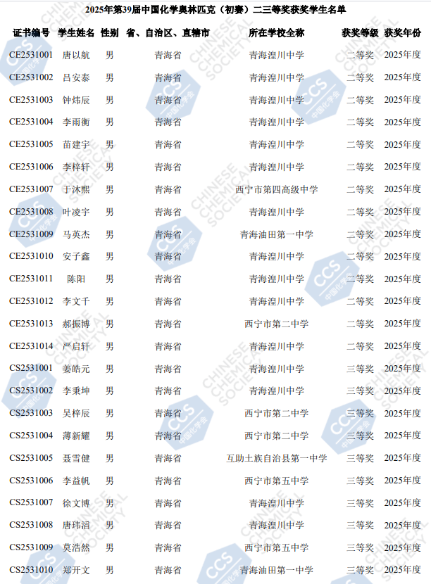 2025青海赛区第39届化学竞赛初赛省二获奖名单