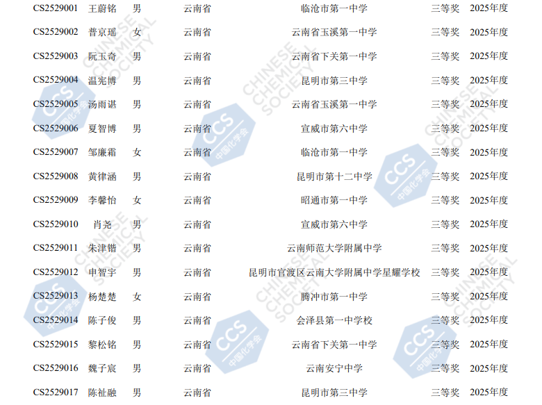 2025云南赛区第39届化学竞赛初赛省三获奖名单