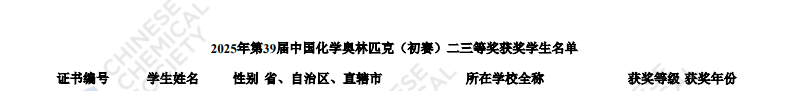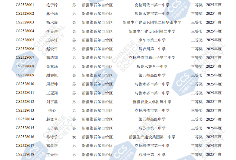 2025新疆赛区第39届化学竞赛初赛省三获奖名单