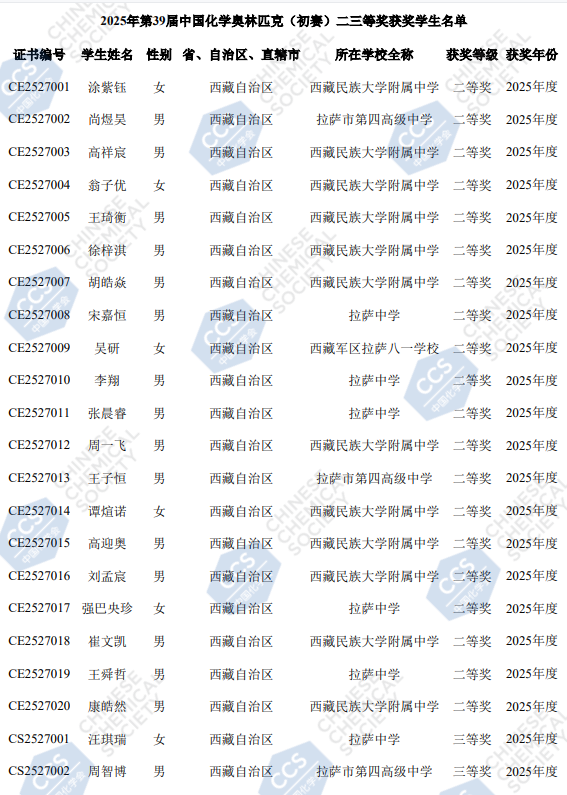2025西藏赛区第39届化学竞赛初赛省二获奖名单