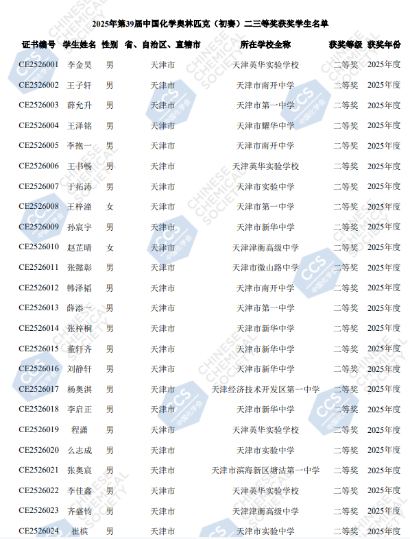 2025天津赛区第39届化学竞赛初赛省二获奖名单