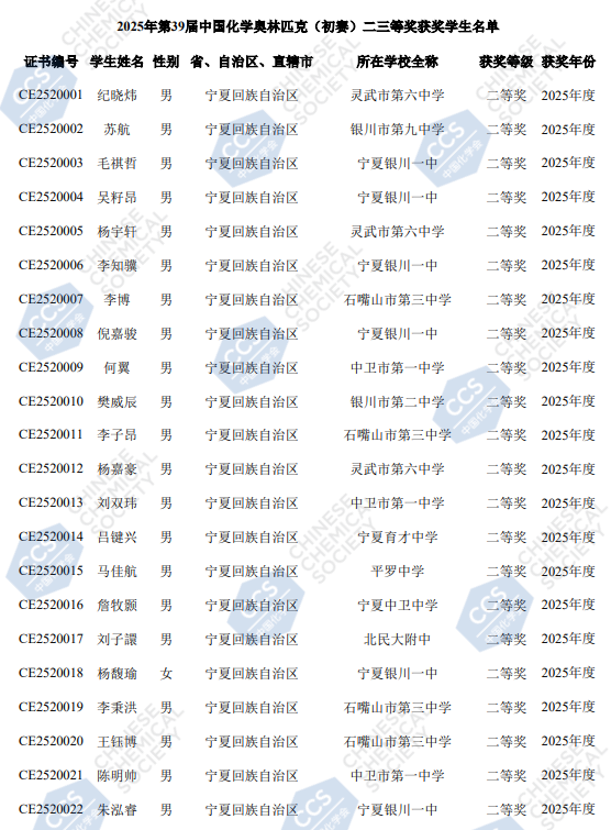 2025宁夏赛区第39届化学竞赛初赛省二获奖名单