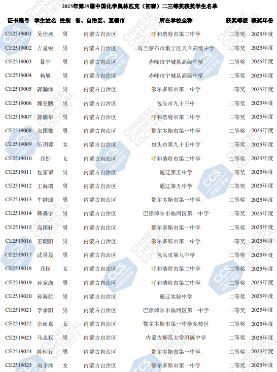 2025内蒙古赛区第39届化学竞赛初赛省二获奖名单