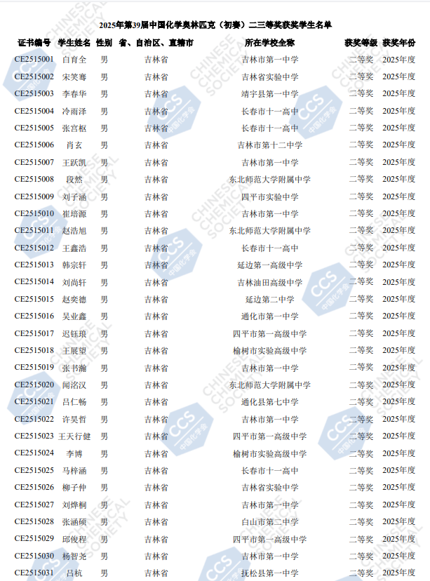 2025吉林赛区第39届化学竞赛初赛省二获奖名单
