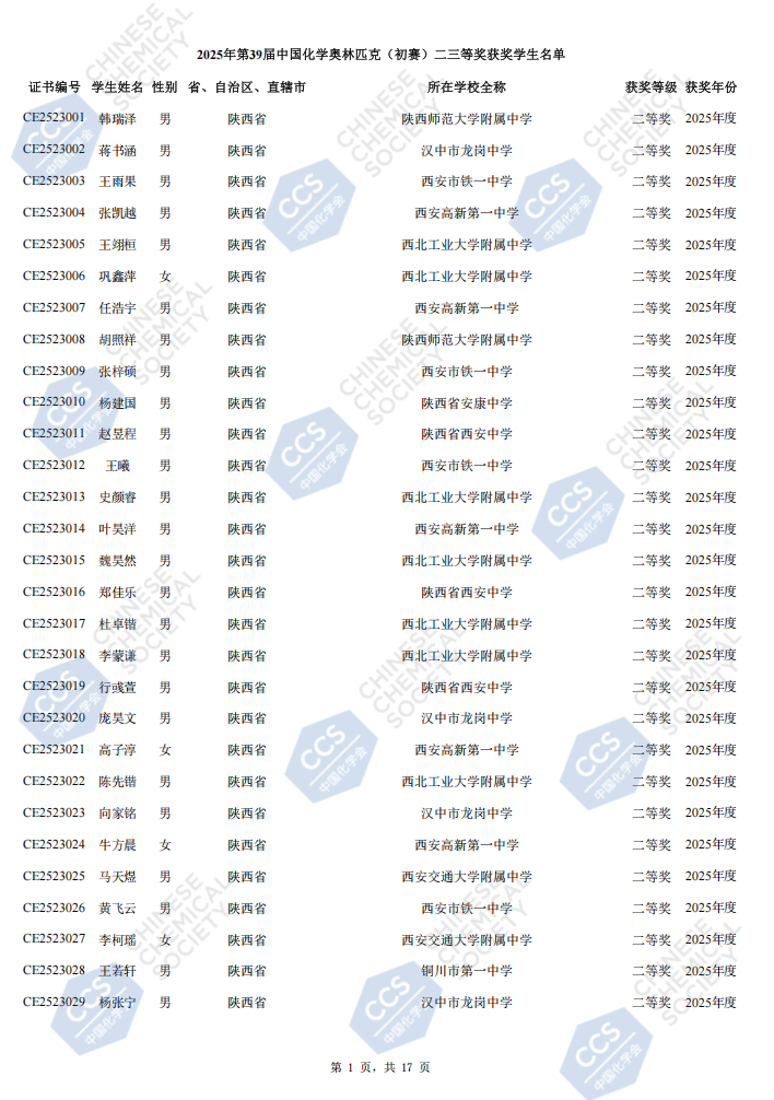 2025陕西赛区第39届化学竞赛初赛省二获奖名单